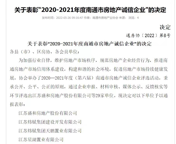 近日,南通市房地產(chǎn)業(yè)協(xié)會公布了關(guān)于表彰“2020-2021年度南通市房地產(chǎn)誠信企業(yè)”的決定。決定指出,協(xié)會秉承公開、公平、公正的原則,通過企業(yè)申報、材料審核、媒體公示、反饋核實(shí)等環(huán)節(jié)評選出江蘇盛和房地產(chǎn)股份有限公司等29家單位,予以通報表彰。